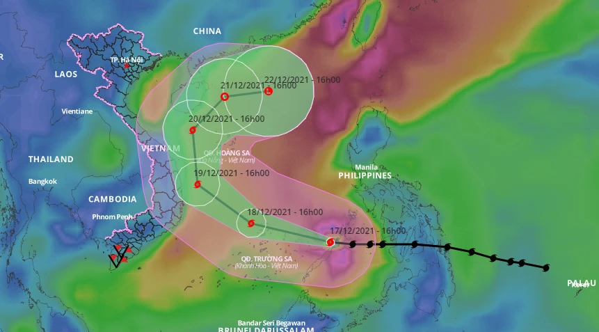 Trung tâm Dự báo Khí tượng Thủy văn quốc gia cho biết, lúc 16 giờ chiều 17-12, vị trí tâm bão RAI ở khoảng 10,3 độ Vĩ Bắc; 118,7 độ Kinh Đông, cách đảo Song Tử Tây khoảng 500km về phía Đông Đông nam.