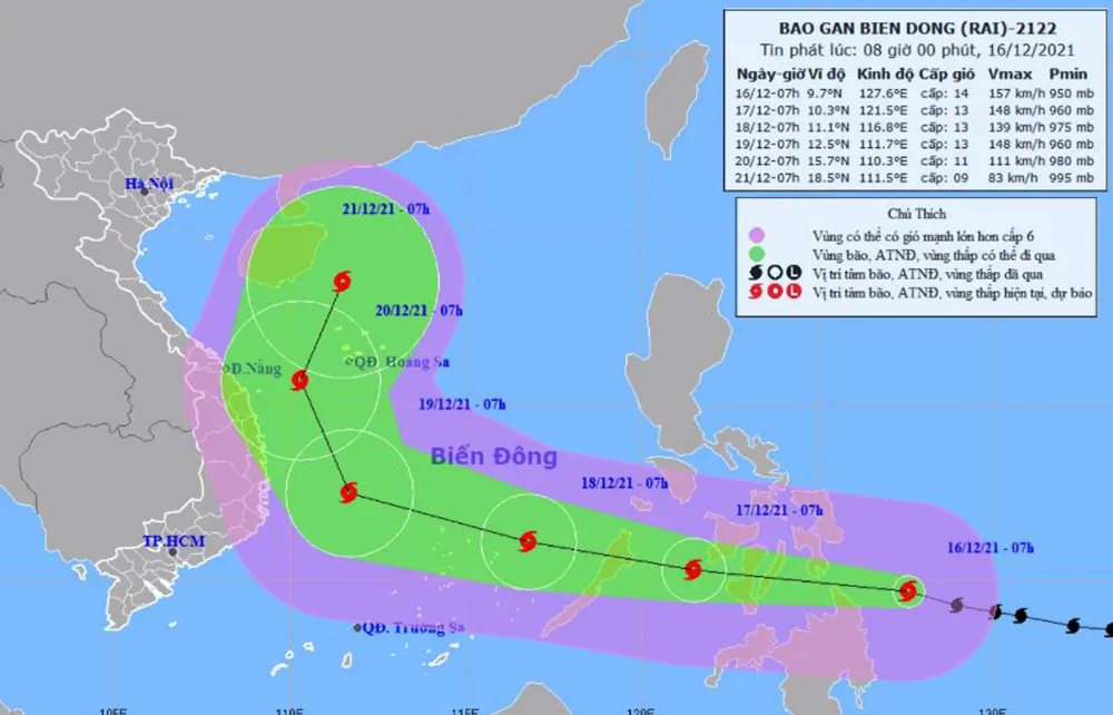 Trung tâm Dự báo Khí tượng Thủy văn Quốc gia dự báo, đến 7 giờ ngày 18-12, tâm bão có tên quốc tế là RAI ở khoảng 11,1 độ Vĩ Bắc; 116,8 độ Kinh Đông, cách đảo Song Tử Tây khoảng 270km về phía Đông Đông Nam. Sức gió mạnh nhất vùng gần tâm bão mạnh cấp 13 (135-150km/giờ), giật cấp 16.