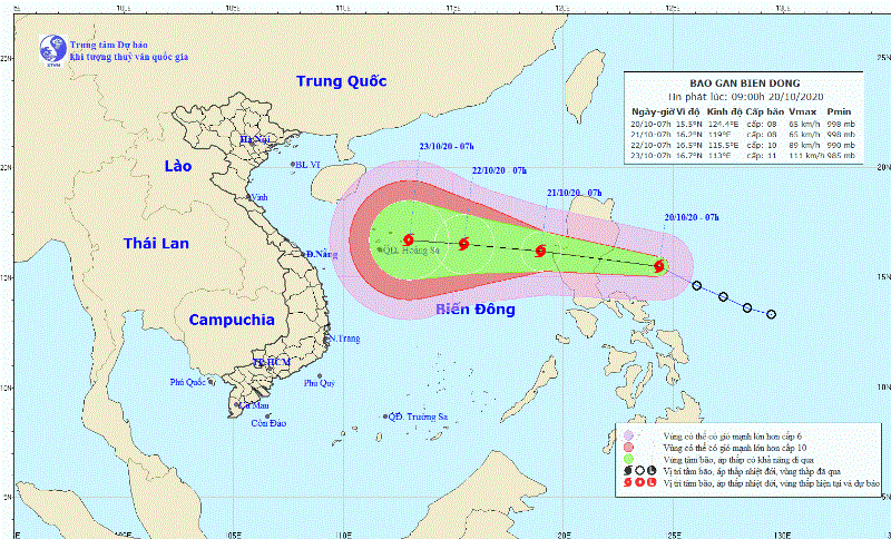 Dự báo mưa ở Quảng Trị đến Quảng Ngãi sẽ kéo dài đến ngày 21-10. Tổng lượng mưa phổ biến từ 100-150mm, có nơi trên 200mm. Trong ngày và đêm nay (20-10) ở Nam Hà Tĩnh, Quảng Bình có mưa vừa, có nơi mưa to với tổng lượng mưa phổ biến 40-80mm, có nơi trên 80mm.