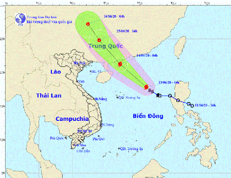 Dự kiến đến chiều mai (14-6), tâm bão sẽ ở ngay trên vùng biển phía nam của tỉnh Quảng Đông (Trung Quốc). Cường độ bão mạnh cấp 9, giật cấp 12.