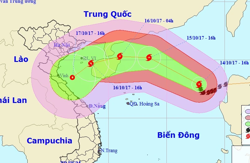 Trung tâm Dự báo Khí tượng Thủy văn Trung ương cho biết vào lúc 16 giờ chiều nay (14-10), vị trí tâm bão ở vào khoảng 17,9 độ Vĩ Bắc; 117,8 độ Kinh Đông, cách quần đảo Hoàng Sa (Việt Nam) khoảng 590 km về phía Đông Đông Bắc. Sức gió mạnh nhất ở vùng gần tâm bão mạnh cấp 10-11 (90-115 km/giờ), giật cấp 13.