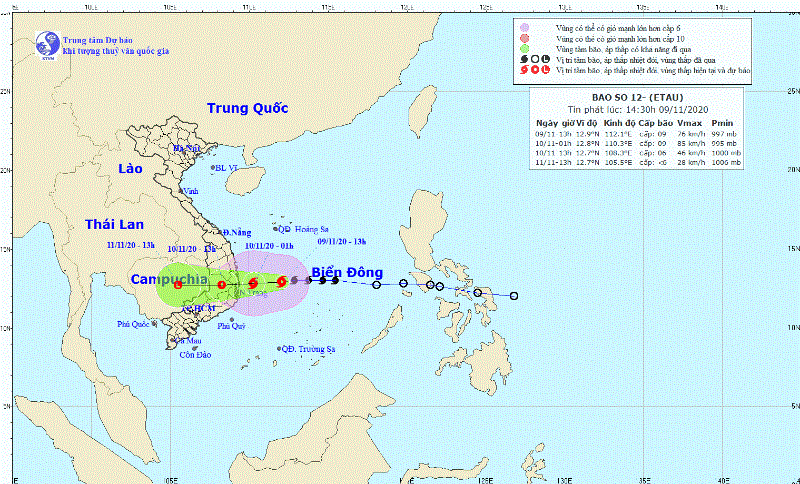 Dự báo trong 12 giờ tới, bão di chuyển theo hướng Tây, mỗi giờ đi được 15-20km và có khả năng mạnh thêm. Đến 01 giờ ngày 10-11, vị trí tâm bão ở khoảng 12,8 độ Vĩ Bắc; 110,3 độ Kinh Đông, cách bờ biển các tỉnh từ Bình Định đến Ninh Thuận khoảng 120km về phía Đông. Sức gió mạnh nhất vùng gần tâm bão mạnh cấp 9 (75-90km/giờ), giật cấp 12.