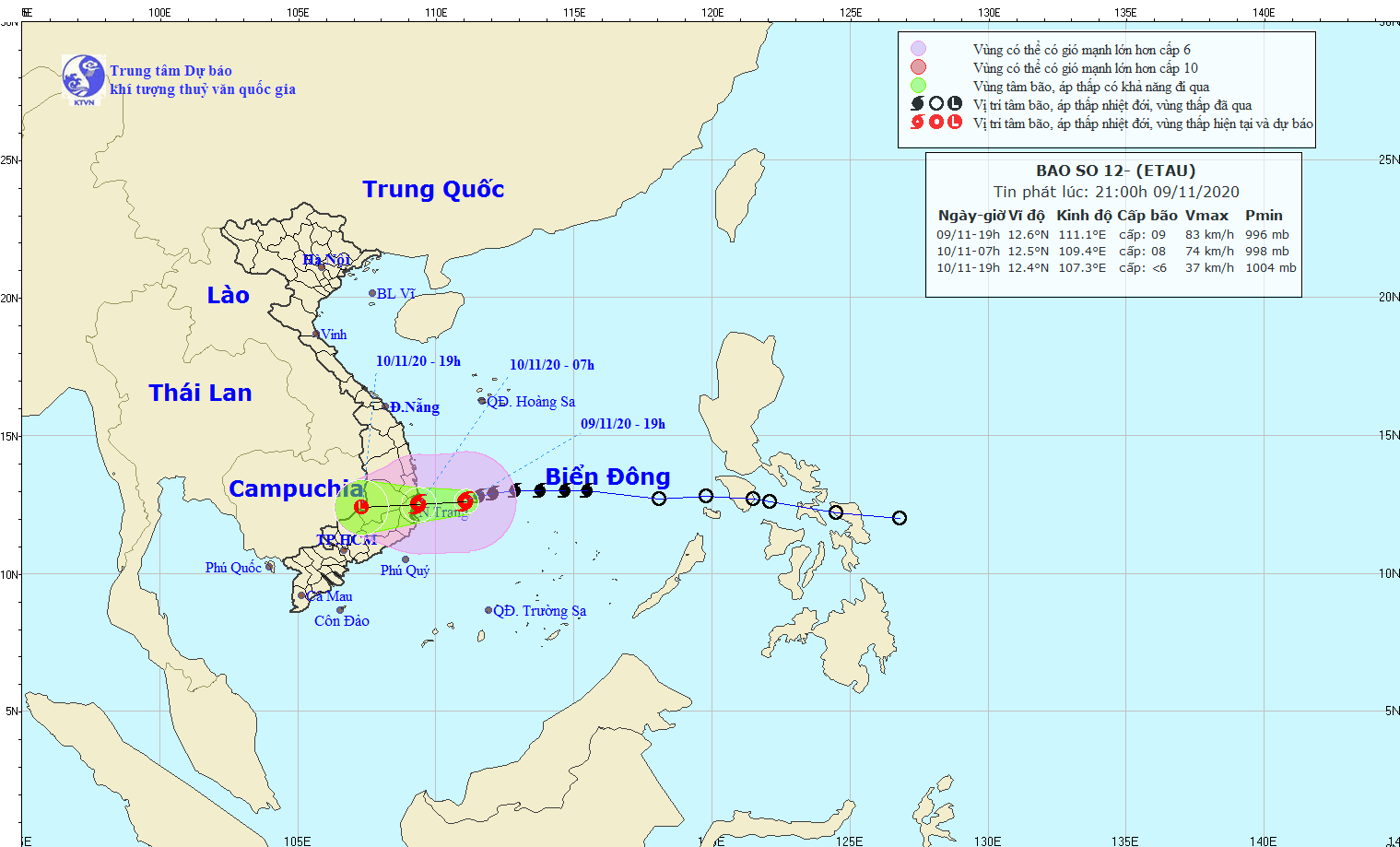 Trung tâm Dự báo Khí tượng thủy văn quốc gia vừa phát đi tin bão khẩn cấp, vào 19 giờ tối nay, 9-11, vị trí tâm bão số 12 ở khoảng 12,6 độ Vĩ Bắc; 111,1 độ Kinh Đông, cách bờ biển các tỉnh từ Bình Định đến Ninh Thuận khoảng 180km về phía Đông.