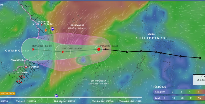 Dự báo trong 12 đến 24 giờ tới, bão di chuyển theo hướng tây, tốc độ 20 km/giờ, hướng vào đất liền các tỉnh từ Bình Định - Ninh Thuận. Khoảng 19 giờ tối 9-11, bão còn cách bờ biển các tỉnh này khoảng 230 km về phía đông, cường độ cấp 9, giật cấp 11.