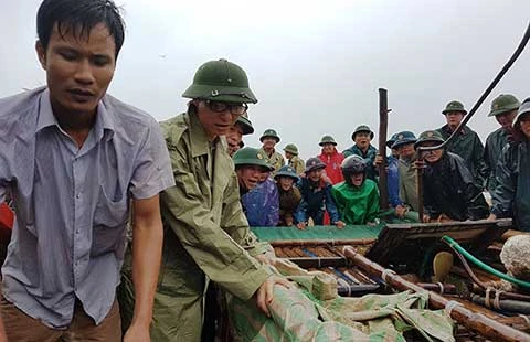Phó Thủ tướng Vũ Đức Đam (thứ hai từ trái sang) đã lội nước. Cùng người dân đẩy thuyền bè vào nơi an toàn. Ảnh: DT
