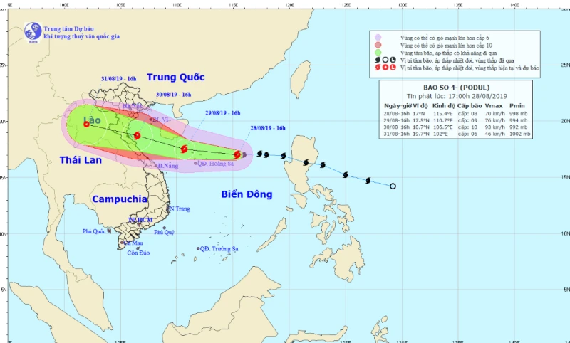 Theo cập nhật mới nhất của Trung tâm Dự báo khí tượng thủy văn Quốc gia, hồi 16 giờ ngày 28-8, vị trí tâm bão ở vào khoảng 17,0 độ vĩ Bắc; 115,4 độ kinh Đông, cách quần đảo Hoàng Sa khoảng 340 km về phía đông. Sức gió mạnh nhất vùng gần tâm bão mạnh cấp 8 (60-75 km/giờ), giật cấp 10. Bán kính gió mạnh cấp 6, giật cấp 8 trở lên khoảng 100 km tính từ tâm bão.