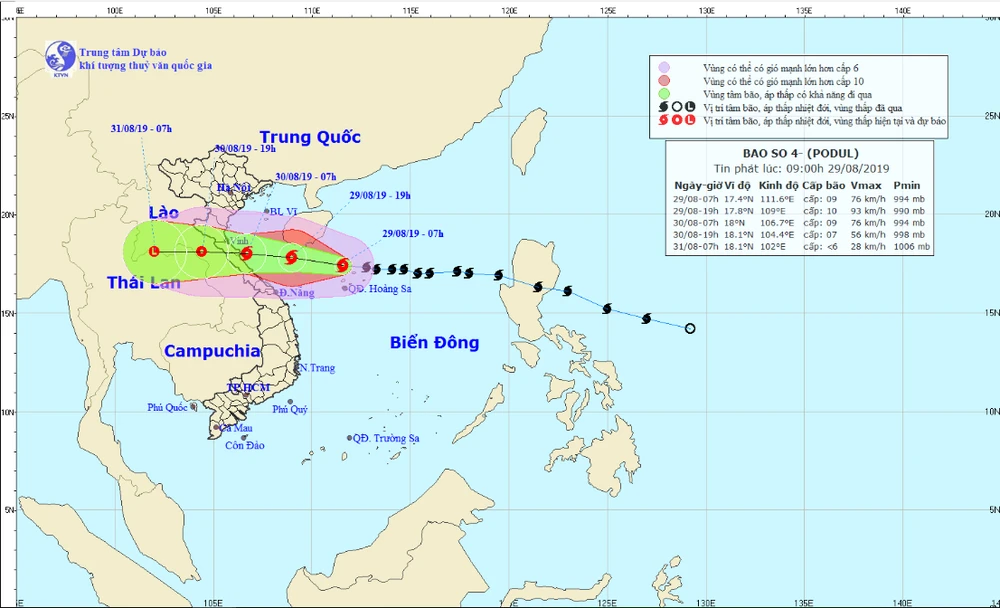 Theo cập nhật mới nhất của Trung tâm Dự báo khí tượng thủy văn quốc gia, hồi 7 giờ sáng nay, (29-8), vị trí tâm bão số 4 trên khu vực phía bắc quần đảo Hoàng Sa, cách đất liền các tỉnh Nghệ An - Quảng Bình khoảng 550 km về phía đông. Sức gió mạnh nhất vùng gần tâm bão mạnh cấp 9 (75-90 km/giờ), giật cấp 11.