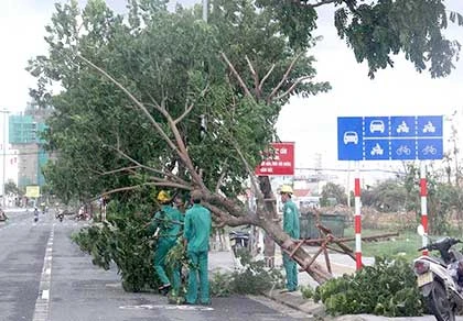 Công nhân cây xanh khắc phục sự cố cây gãy, đổ sau bão ở TP Đà Nẵng. Ảnh: C.TH