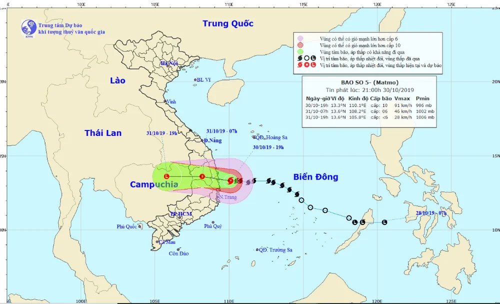 Theo Trung tâm Dự báo Khí tượng Thủy văn quốc gia, hồi 20 giờ ngày 30-10, vị trí tâm bão số 5 ngay trên vùng biển ven bờ các tỉnh Quảng Ngãi, Bình Định, Phú Yên. Sức gió mạnh nhất vùng gần tâm bão mạnh cấp 9-10 (75-100km/giờ), giật cấp 12. Bán kính gió mạnh từ cấp 6, giật từ cấp 8 trở lên khoảng 120km tính từ tâm bão.