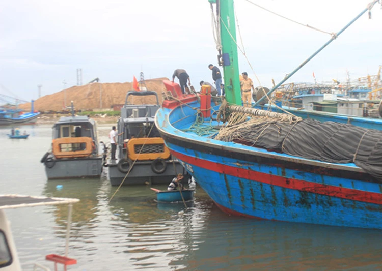 Các lực lượng chức năng đang cứu hộ một tàu cá mắc cạn ở vịnh Quy Nhơn. Ảnh: HT