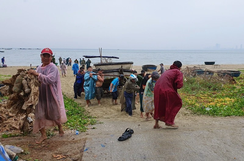 Ngư dân Đà Nẵng đội mưa kéo thuyền thúng lên bờ. Ảnh: TẤN VIỆT