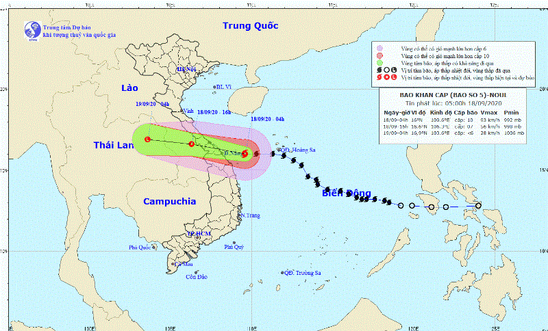 Sáng 18-9, tin từ Trung tâm Dự báo khí tượng thủy văn quốc gia (TTKTTVQG), hiện bão số 5 đang ở ngay trên vùng biển ngoài khơi các tỉnh từ Quảng Bình đến Quảng Nam.