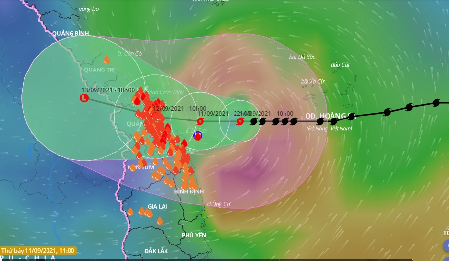 Dự báo trong 12 giờ tới, bão di chuyển theo hướng tây với tốc độ 5-10km/giờ. Đến khoảng 22 giờ đêm nay, bão sẽ ở ngay trên vùng biển từ Quảng Trị - Quảng Ngãi. Sức gió mạnh nhất vùng gần tâm bão mạnh cấp 8-9 (65-90km/giờ), giật cấp 11.