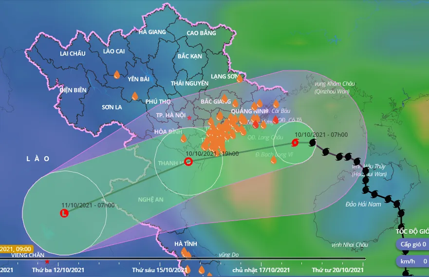 Đến 19 giờ ngày 10-10, vị trí tâm ATNĐ ở khoảng 20,1 độ Vĩ Bắc; 105,8 độ Kinh Đông. Sức gió mạnh nhất vùng gần tâm ATNĐ mạnh cấp 6 (40-50km/giờ), giật cấp 8.