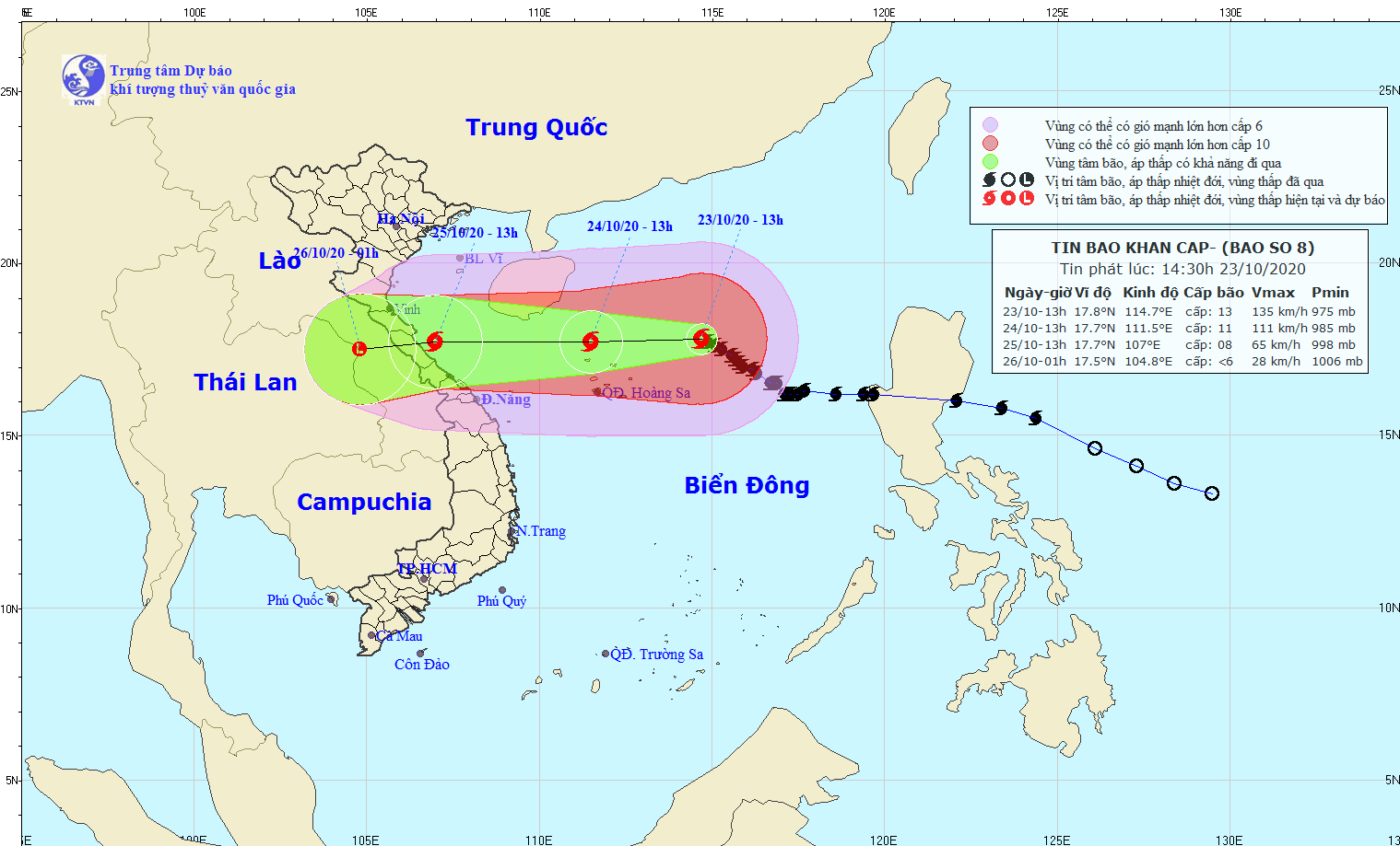 Thông tin từ Trung tâm Dự báo Khí tượng thủy văn Quốc gia (Trung tâm KTTVQG) cho biết, hồi 13 giờ chiều nay, 23-10, bão số 8 đang ở khoảng 17,8 độ Vĩ Bắc; 114,7 độ Kinh Đông, cách quần đảo Hoàng Sa khoảng 280km về phía Đông Đông Bắc.