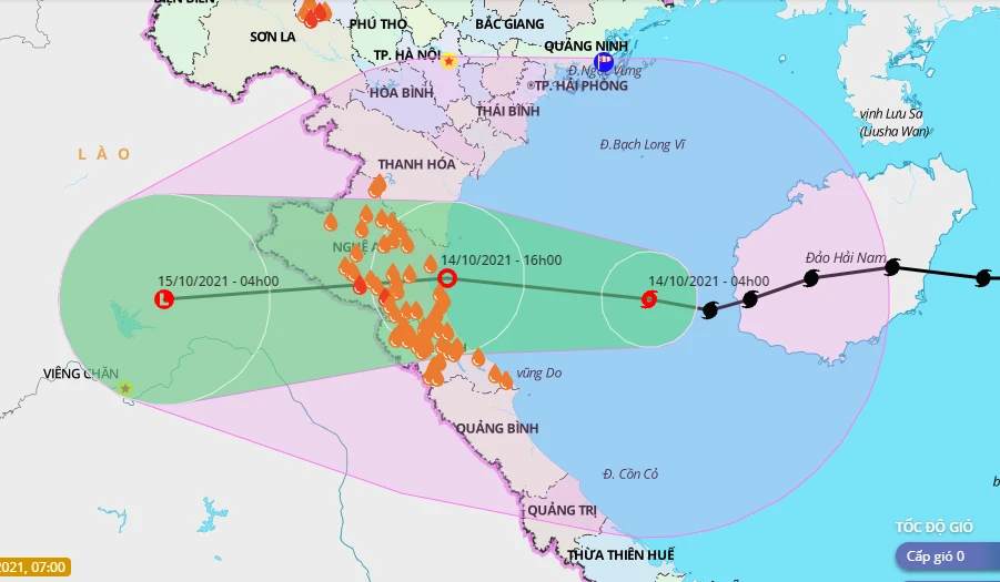 Lúc 7 giờ, vị trí tâm ATNĐ ở khoảng 19,0 độ Vĩ Bắc; 107,5 độ Kinh Đông, cách bờ biển Thanh Hóa khoảng 205km, cách bờ biển Nghệ An khoảng 203km, cách bờ biển Hà Tĩnh khoảng 190km.