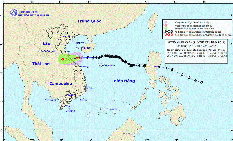 Đến 04 giờ ngày 26-10, vị trí trung tâm vùng áp thấp ở vào khoảng 17,3 độ Vĩ Bắc; 105,3 độ Kinh Đông, trên khu vực Trung Lào. Sức gió mạnh nhất ở trung tâm vùng áp thấp giảm xuống dưới cấp 6 (dưới 40km/giờ).