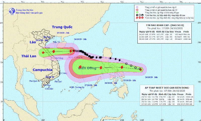 Dự báo trong 24 giờ tới, bão di chuyển theo hướng tây, mỗi giờ đi được  15-20km. Đến 16 giờ ngày 25-10, vị trí tâm bão ở khoảng 17,7 độ Vĩ Bắc; 107,8 độ Kinh Đông, cách đất liền các tỉnh Hà Tĩnh đến Quảng Trị khoảng 140km về phía đông. Sức gió mạnh nhất vùng gần tâm bão mạnh cấp 8 (60-75km/giờ), giật cấp 10.