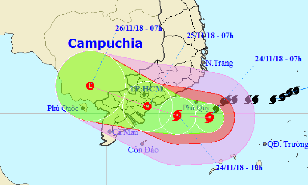Theo Trung tâm Dự báo Khí tượng Thủy văn Quốc gia, lúc 7 giờ sáng 24-11, vị trí tâm bão ở cách đảo Phú Quý khoảng 100 km, cách Phan Thiết khoảng 190 km, cách Vũng Tàu khoảng 240 km, cách Bến Tre 300 km. Sức gió mạnh nhất vùng gần tâm bão mạnh cấp 9-10 (75-100 km/giờ), giật cấp 12.