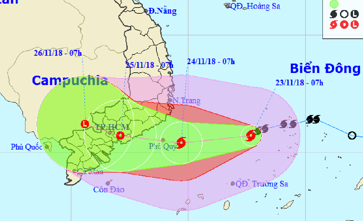 Dự báo đến sáng 25-11, bão suy yếu thành áp thấp nhiệt đới trên đất liền các tỉnh Nam Trung bộ và Đông Nam bộ với sức gió mạnh nhất vùng gần tâm áp thấp nhiệt đới mạnh cấp 7 (50-60 km/giờ), giật cấp 9.