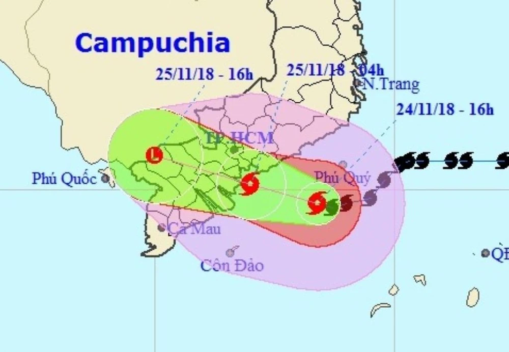 Dự báo trong 12 giờ tới, bão di chuyển theo hướng Tây mỗi giờ đi được khoảng 10-15 km. Đến 4 giờ ngày 25-11, vị trí tâm bão ở khoảng 10,1 độ Vĩ Bắc; 107,0 độ Kinh Đông, ngay trên bờ biển các tỉnh từ Nam Bình Thuận đến Bến Tre. Sức gió mạnh nhất vùng gần tâm bão mạnh cấp 8-9 (60-90 km/giờ), giật cấp 11. Bán kính gió mạnh cấp 6, giật cấp 8 khoảng 130 km.