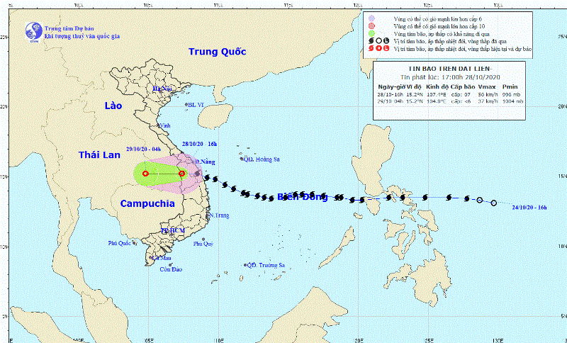 Chiều 28-10, Trung tâm Dự báo Khí tượng thủy văn quốc gia cho biết, bão số 9 sau khi đi vào đất liền các tỉnh từ Đà Nẵng đến Phú Yên đã suy yếu thành áp thấp nhiệt đới (ATNĐ).