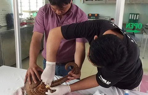 Chuyên gia của SVW và Trạm Cứu hộ động vật hoang dã Củ Chi đang kiểm tra sức khỏe cho cá thể tê tê. Ảnh: SVW