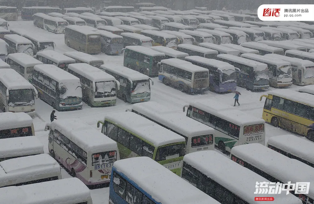 Bãi đậu xe buýt ngập trong tuyết tại Hợp Phì, tỉnh An Huy vào ngày 27-1-2008. Ảnh: AFP
