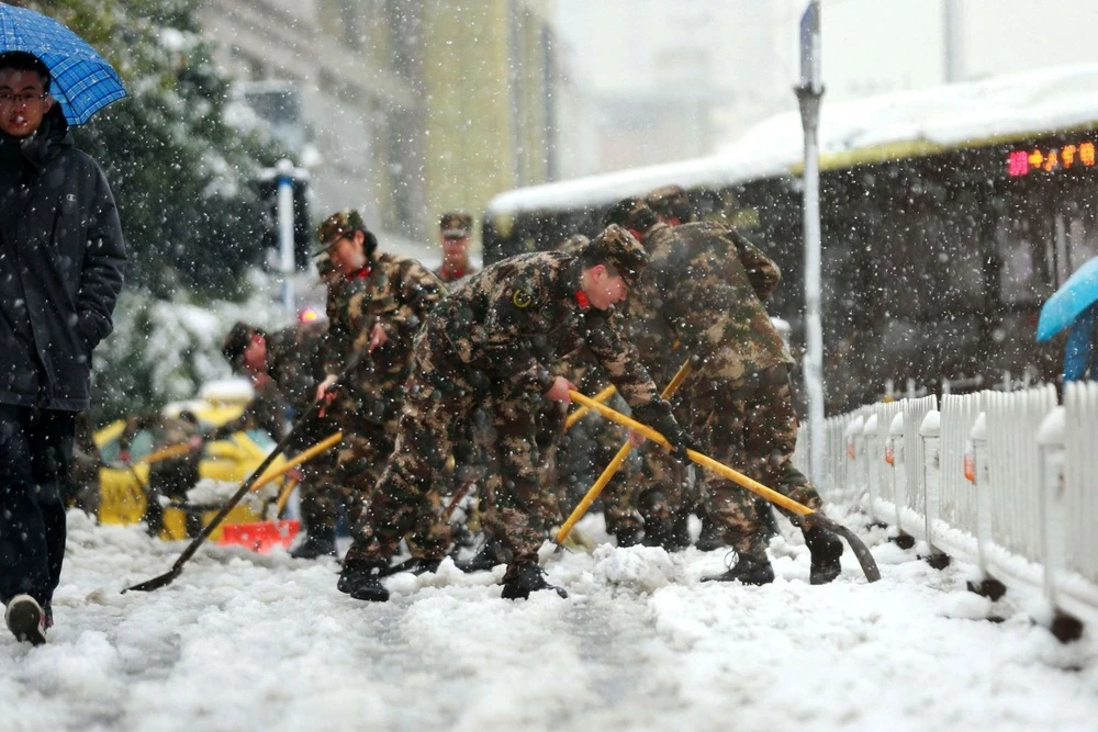 Binh lính Trung Quốc dọn tuyết để thông thoáng đường phố tại Nam Kinh, tỉnh Giang Tô vào ngày 4-1. Ảnh: AFP