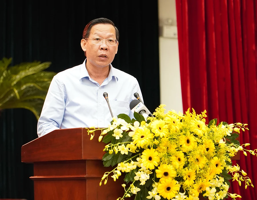 Chủ tịch UBND TP.HCM Phan Văn Mãi phát biểu tại hội nghị. Ảnh: TÁ LÂM