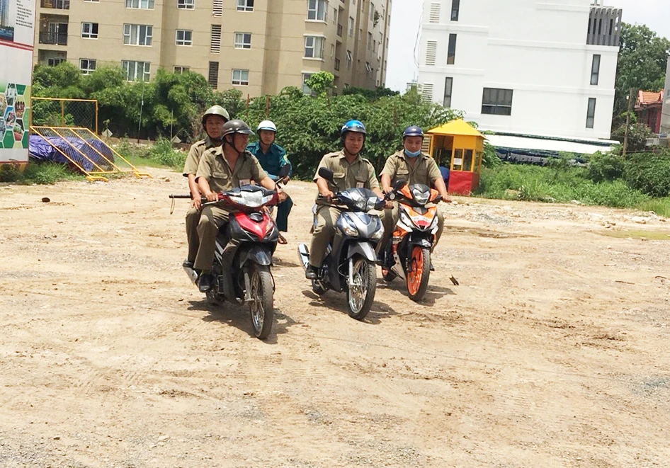 Bảo vệ dân phố khu phố 5, phường Đông Hưng Thuận, quận 12, TP.HCM đang tuần tra trên địa bàn. Ảnh: TRẦN NGỌC