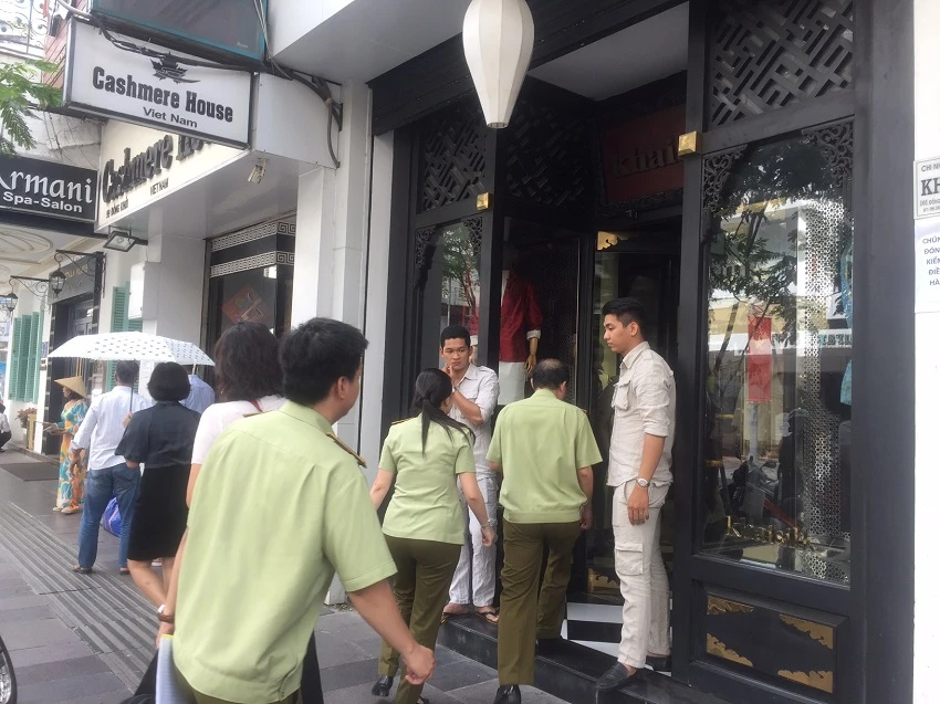 Lực lượng chức năng đến kiểm tra cửa hàng Khaisilk tại 101 Đồng Khởi.