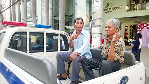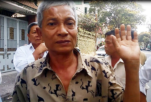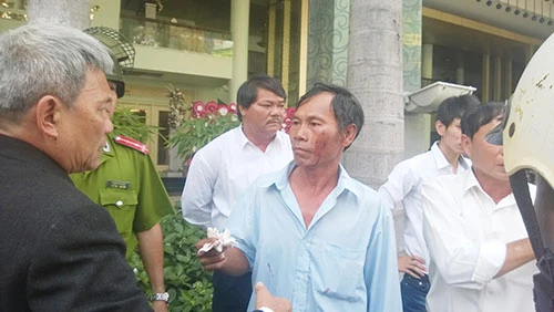 Ông Thái Văn Ly (áo xanh), Thái Văn Súi bị bảo vệ nhà hàng Đông Phương 2, quận Tân Bình đánh thương tích.