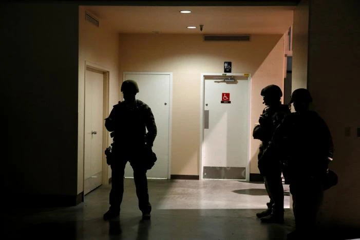 Lực lượng cảnh sát vũ trang được triển khai đến hậu trường, bảo vệ ứng cử viên tổng thống của đảng Cộng hòa. Ảnh: Reuters