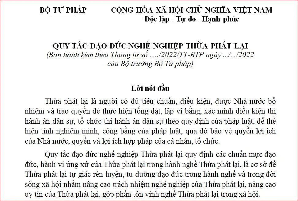 Theo hướng đấy, Bộ Tư pháp đang lấy ý kiến xã hội dự thảo thông tư về Quy tắc đạo đức nghề nghiệp thừa phát lại.