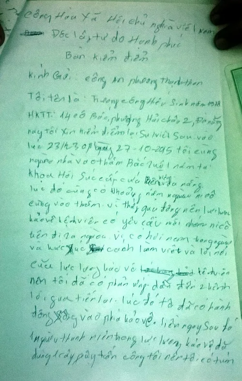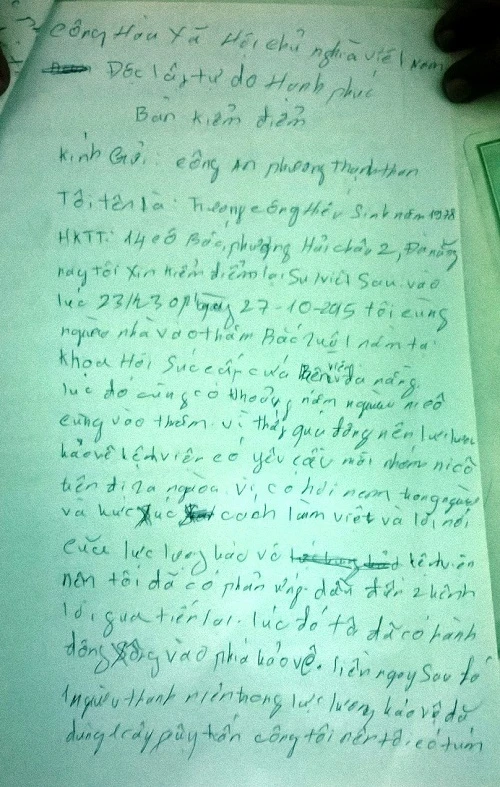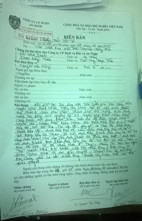 Biên bản tường trình sự việc của bảo vệ BV Đà Nẵng. Ảnh: TT