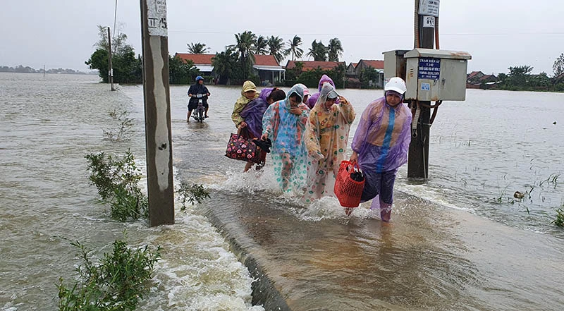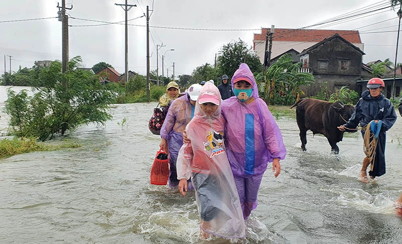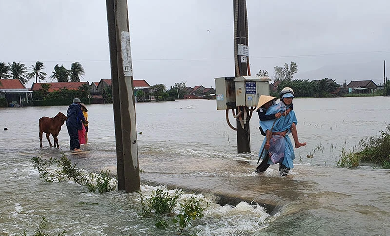 Người dân xã Hòa Mỹ Đông, huyện Tây Hòa, Phú Yên chạy lũ. Ảnh: TẤN LỘC