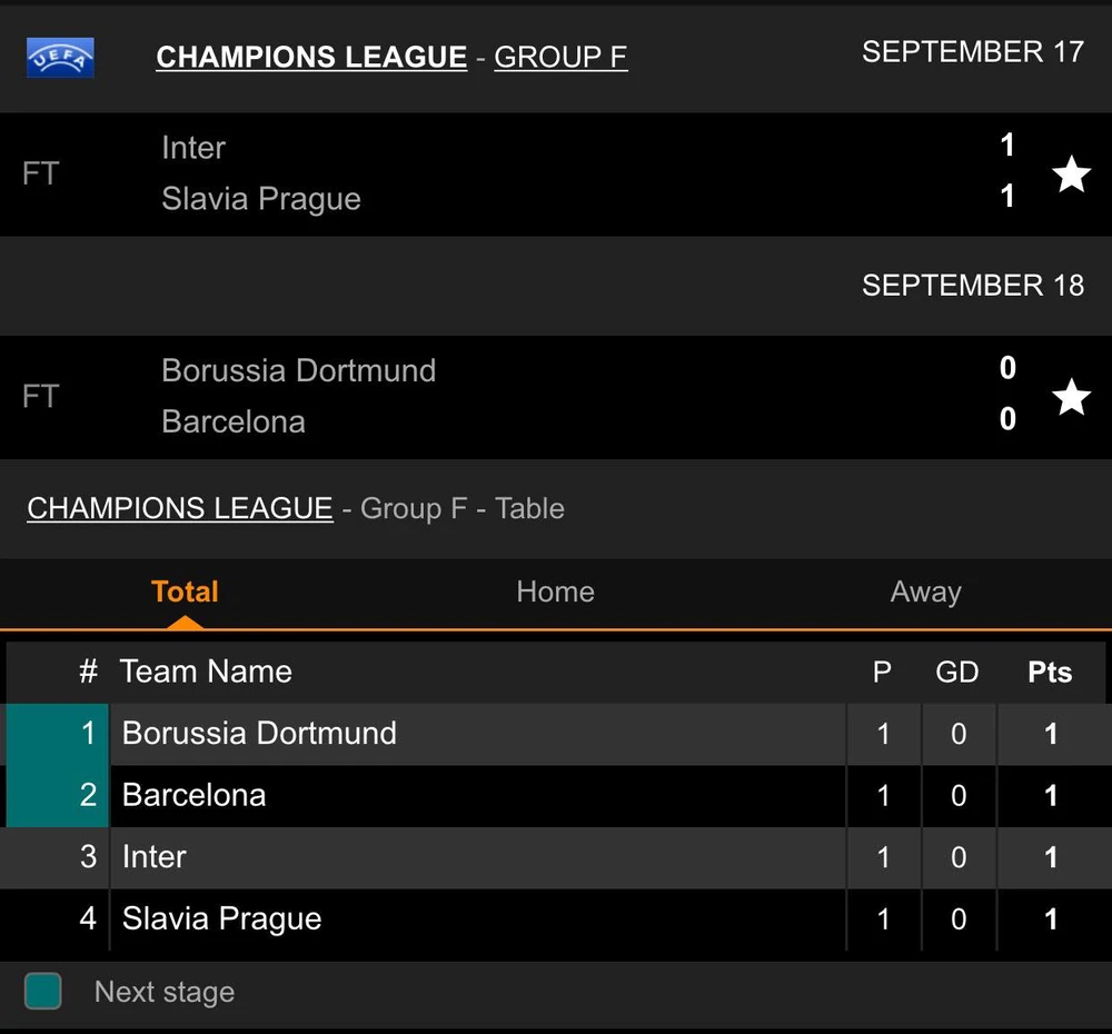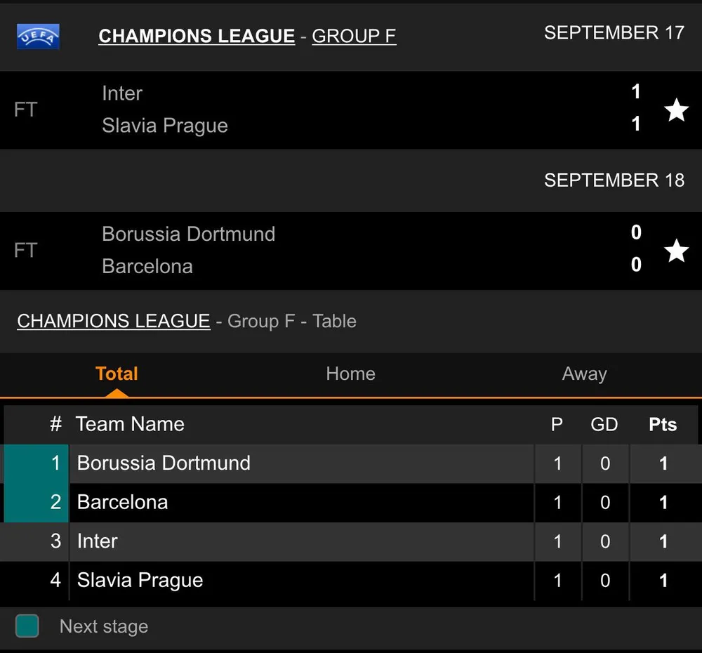 Ở trận đấu còn lại của bảng F, Inter Milan cũng có lượt trận ra quân vòng bảng Champions League không suôn sẻ khi phải chật vật đến những phút cuối mới có thể cầm hòa được đối thủ Slavia Prague ngay trên sân nhà. Inter Milan không chỉ chật vật trong việc tìm kiếm bàn thắng mà đội chủ nhà còn nhận bàn thua trước ở phút 63 khi bị trung phong Peter Olayinka chọc thủng lưới. Phải đợi đến những phút bù giờ Inter Milan mới có được trong tay 1 điểm khi Nicolo Barella gỡ hòa 1-1 cho “nửa xanh” thành Milan.