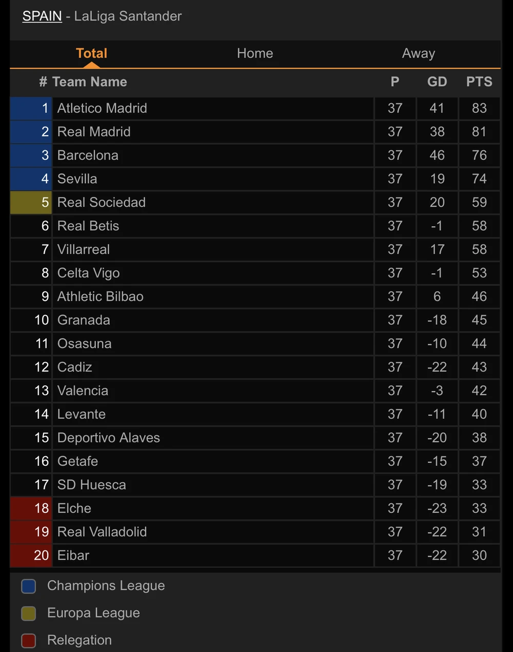Do thua 1-2 trên sân nhà trước Celta Vigo, Barcelona chính thức chia tay cuộc đua vô địch khi đứng vị trí thứ ba với 76 điểm sau 37 vòng đấu. Ngôi đầu bảng vẫn thuộc về Atletico Madrid khi có được 83 điểm, Real Madrid đứng thứ hai với 81 điểm. Ngôi vương sẽ được định đoạt ở vòng đấu cuối khi Atletico Madrid đến làm khách trên sân của Valladolid, còn Real Madrid tiếp đón Villarreal.
