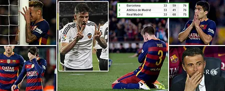 Thua trận với tỉ số 1-2 trước Valencia, Barcelona chính thức bị Atletico san bằng cách biệt về điểm số trên bảng xếp hạng La Liga. Hiện cả hai có cùng 76 điểm, xếp thứ ba là Real Marid với 1 điểm ít hơn hai đội này. Barcelona đã tự bắn vào chân mình và khiến cuộc đua La Liga trở nên hấp dẫn hơn bao giờ hết.