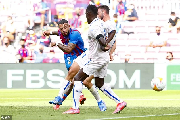 Depay dứt điểm góc hẹp, nâng tỷ số lên 2-1 cho Barca trong hiệp một. Ảnh: AP.