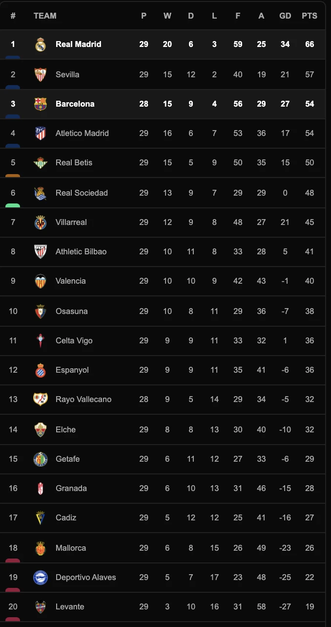 Trong khi đó, Real Madrid vẫn đầu La Liga với 66 điểm, hơn Barcelona 12 điểm nhưng đá nhiều hơn 1 trận. Đội xếp thứ hai là Sevilla có 57 điểm, còn đội thứ tư là Atletico Madrid đồng 54 điểm với Barca.