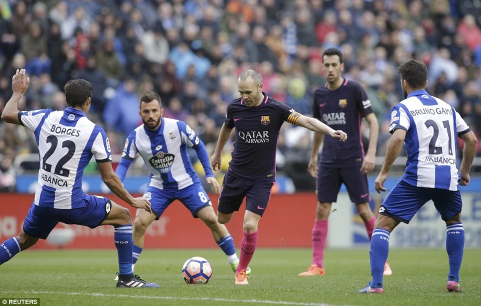 ... còn Iniesta cũng không thể làm gì trước vòng vây của cầu thủ Deportivo.