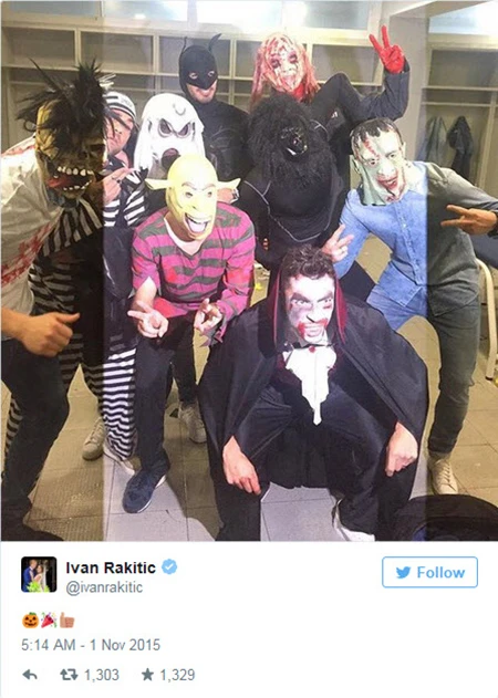 Tiền vệ Ivan Rakitic đưa lên mạng xã hội Twitter hình ảnh các cầu thủ Barcelona trong lễ hội hóa trang mừng Halloween.