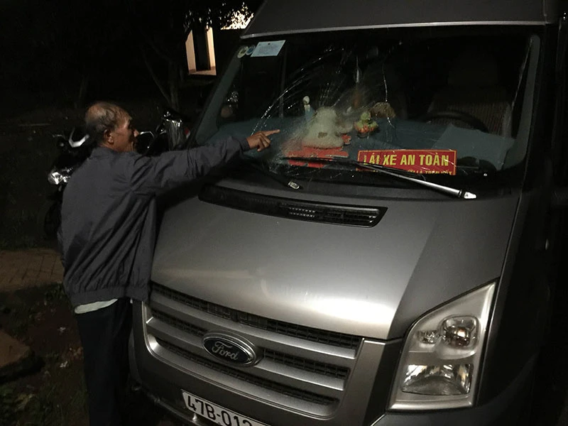 "Xe đang chạy thì nghe một tiếng “rầm”. Tôi vội dừng xe lại kiểm tra thì phát hiện kính trước xe bị trúng đá rạn vỡ, một nhóm thanh niên đang bỏ chạy. Trên xe lúc đó có khoảng 10 người, có hai cháu bé ngồi ghế trước nhưng may mắn không bị thương tích” - ông Thơ kể lại.