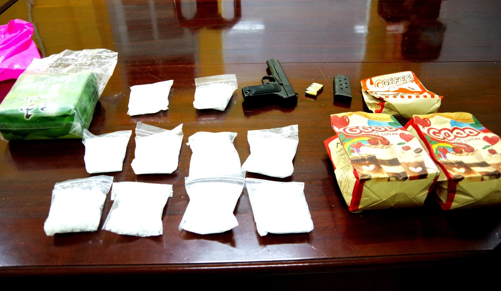 2 kg nghi là ma túy đá cùng khẩu súng, đạn thu giữ trên người Nguyễn Văn Liệt. Ảnh: LĐ