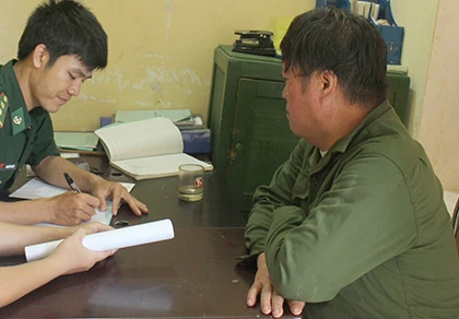 Bộ đội biên phòng đang lấy lời khai của Vàng A Sáng (phải). Ảnh: Th.Hoài