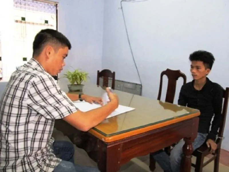 Đối tượng Bình (áo đen) tại cơ quan công an.