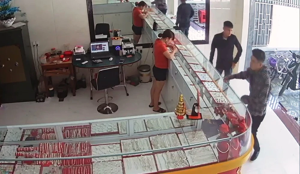 Cường và Lâm vào tiệm vàng bạc Hoàng Sơn lừa bán vàng giả, lấy tiền bị camera tiệm vàng bạc ghi lại.