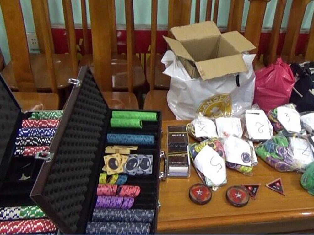 Tại hiện trường, cảnh sát thu giữ gần 320 triệu đồng, 3.400 USD, gần 600 phỉnh dùng để đánh bạc có quy ước tương đương 600 triệu đồng, một bàn chuyên dùng để đánh bài Poker, thẻ ngân hàng, hộ chiếu, hai cuốn sổ dùng để ghi tiền đổi phỉnh và tiền nợ từ các con bạc cùng nhiều tang vật khác.